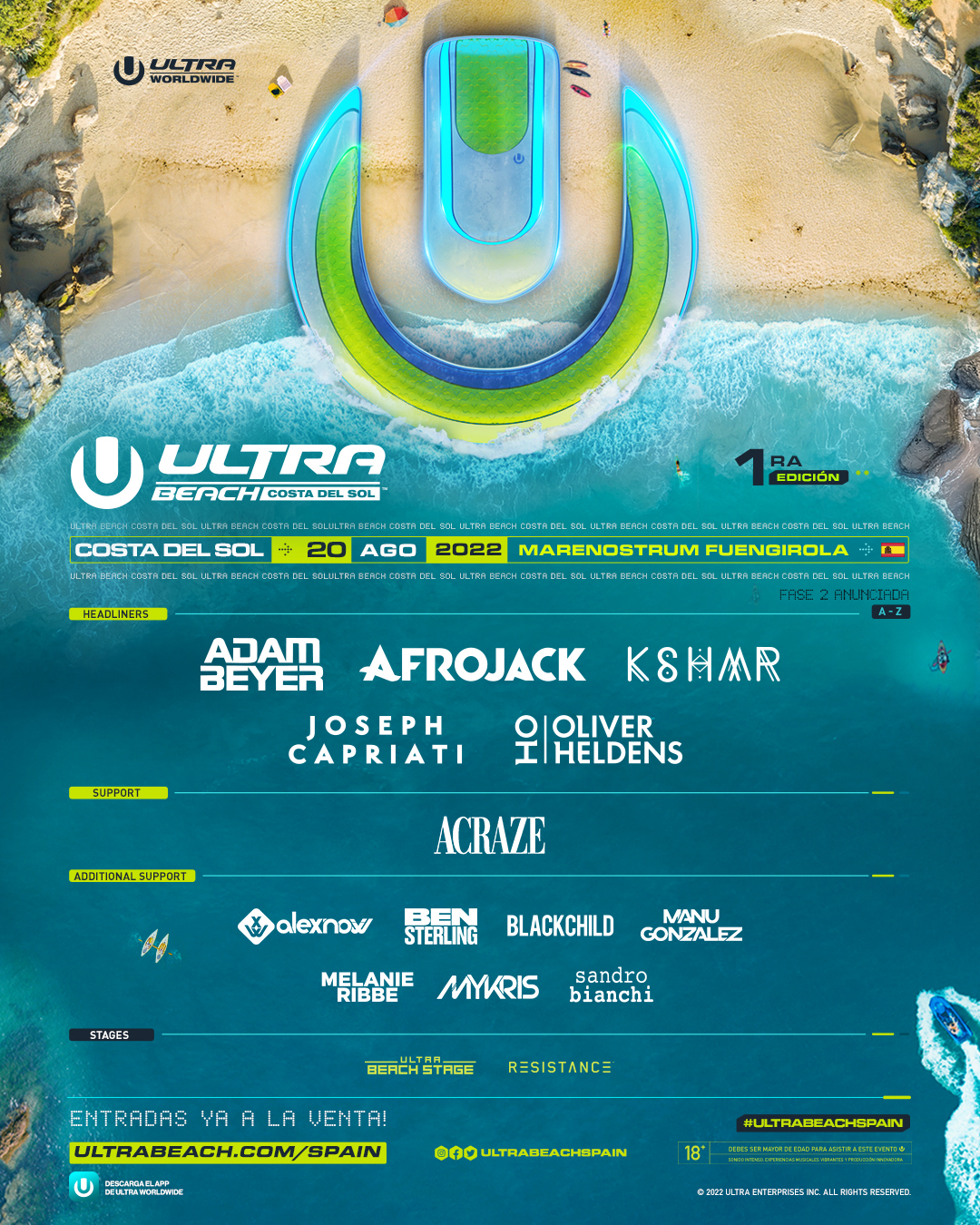 ULTRA WORLDWIDE, la marca de festivales de música más grande del mundo, llega a España con su conocido formato ULTRA BEACH. La primera edición de este evento boutique frente al mar es un maratón de un día que tendrá lugar el sábado 20 de agosto en el espacio Marenostrum (Fuengirola, Málaga).
